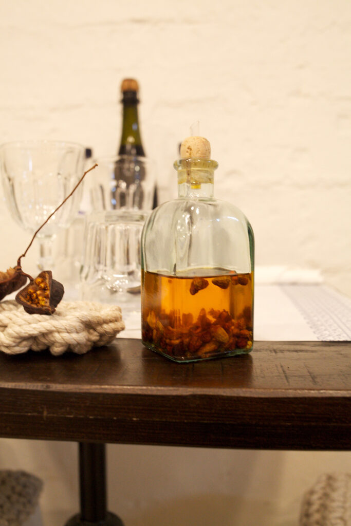El mobiliari, taules i cadires, segueix una estètica neo-rural, amb l’ús de tamborets i cadires Tolix blanques combinades amb coixins de corda de crotxet natural, i taules de fusta massissa, reforçant la sensació d’autenticitat i proximitat.