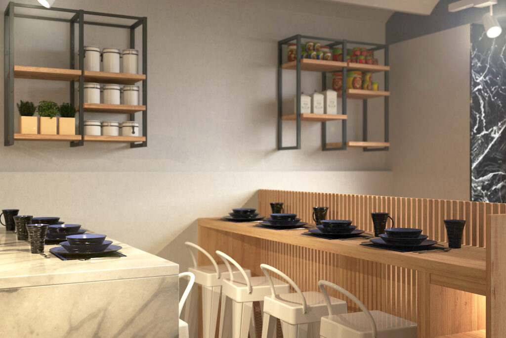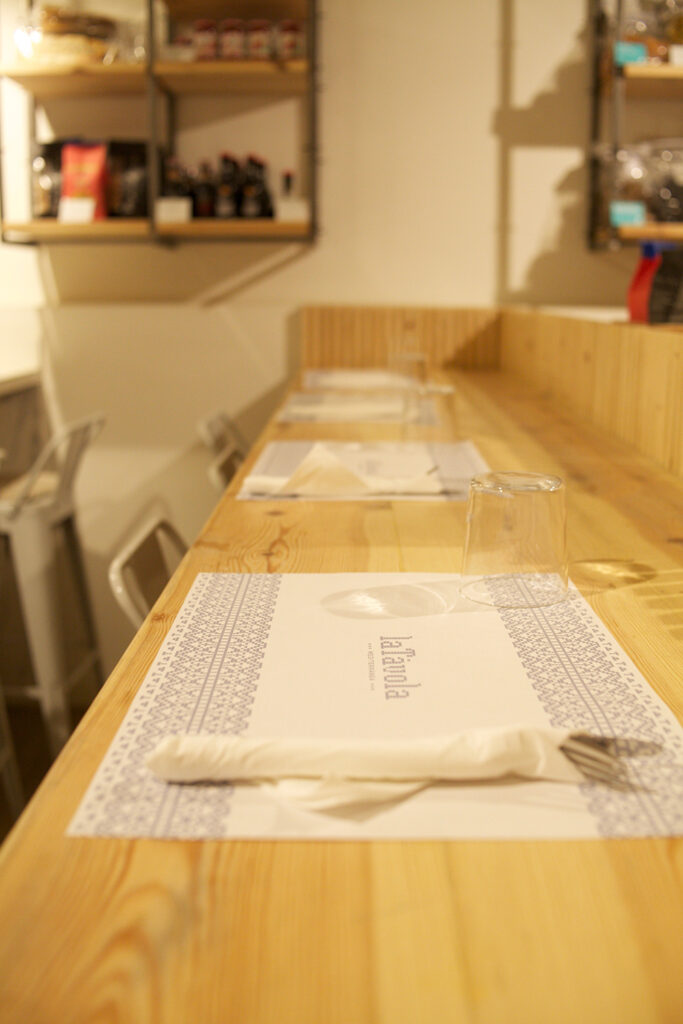 L’espai de botiga s’organitza a partir d’una zona d’exposició de producte fresc i sec, resolta amb neveres i estanteries integrades en mobiliari dissenyat a mida, que garanteix una imatge ordenada i coherent amb la marca. La zona de caixa s’amplia per donar servei tant a la venda directa com al take away i a la degustació, que es pot fer a la barra habilitada o a la sala posterior, on se situa “la tavola” de la botiga: una taula gran pensada per compartir, tant per a grups com per a clients individuals.