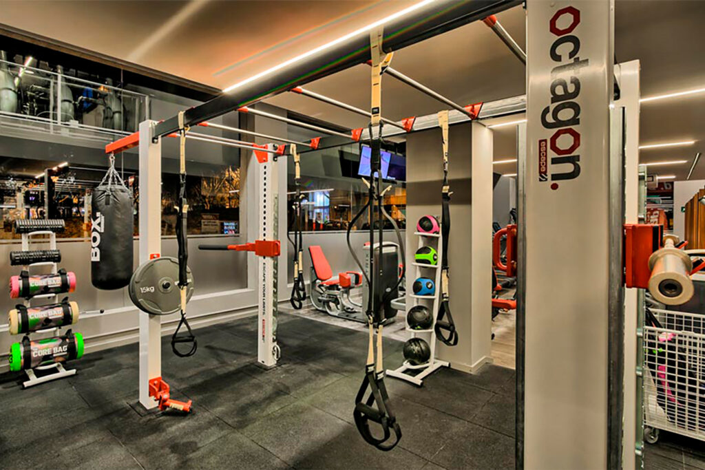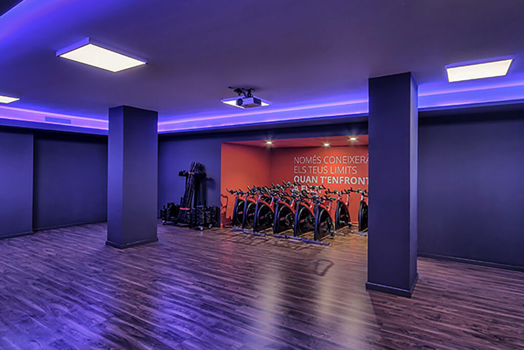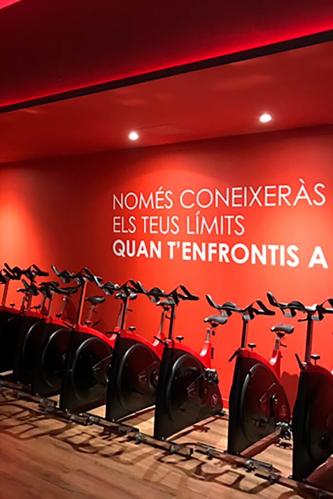 El vermell corporatiu, element identitari imprescindible de la marca, es manté com a fil conductor del projecte, però es combina amb una estratègia d’interiorisme orientada a generar espais acollidors i propers, més enllà de les sales d’activitats dirigides i de les zones de màquines. Es dissenya una recepció adaptable a diferents superfícies, amb un taulell clarament identificable i un espai d’estar amb caràcter domèstic, equipat amb butaques i una taula llarga que pot ser utilitzada tant pel personal del centre com pels usuaris.