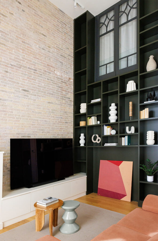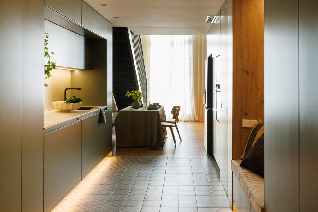 El projecte recupera elements originals com biguetes de ferro, revoltó ceràmic i murs d’obra vista, que conviuen amb una paleta neutra i un accent verd grisós que unifica la imatge de l’habitatge. L’escala, abans un element residual i insegur, es transforma en un element estructurador de l’espai i del projecte, reforçant la identitat industrial del pis.