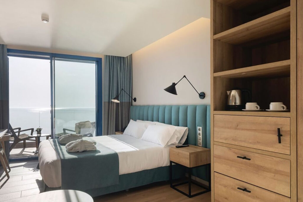 L’estètica interior respon a la voluntat de la propietat de conservar el caràcter d’hotel de costa, utilitzant una paleta de materials clars, paviments combinats i tons blaus que reforcen la relació amb l’entorn marítim. Tot el mobiliari s’ha dissenyat a mida en roure natural, amb elements integrats i lleugers per mantenir una imatge serena i equilibrada.