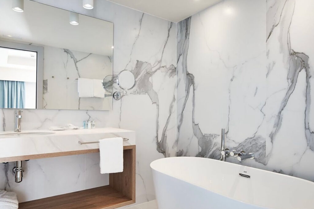 Els banys, seguint la mateixa filosofia, es revesteixen completament amb composite Calacatta i sanitaris blancs, amb l’objectiu d’aportar lluminositat i sensació d’amplitud a uns espais que no sempre disposen de llum natural directa.